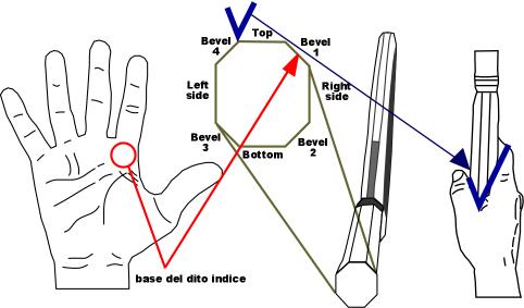 In questo tipo di impugnatura, che è chiamata anche “a martello”, la mano è posizionata quasi tutta sopra il manico, con una piccola parte dietro, esattamente come si tenesse in mano un martello. La “V” che si forma fra il pollice e l’indice corrisponde all’angolo dell’ottagono del manico tra il lato “top” e lo smusso n. 4. La base del dito indice corrisponde allo smusso n. 1 (n. 4 per i mancini). Continua a leggere